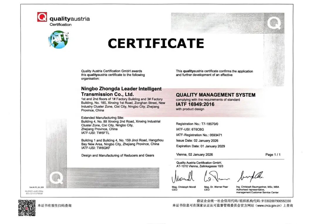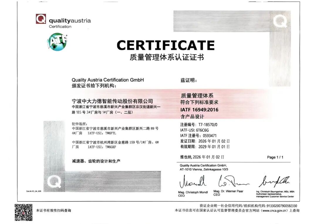 近日,宁波中大力德智能传动股份有限公司成功通过IATF16949:2016质量管理体系认证,并获得认证证书。