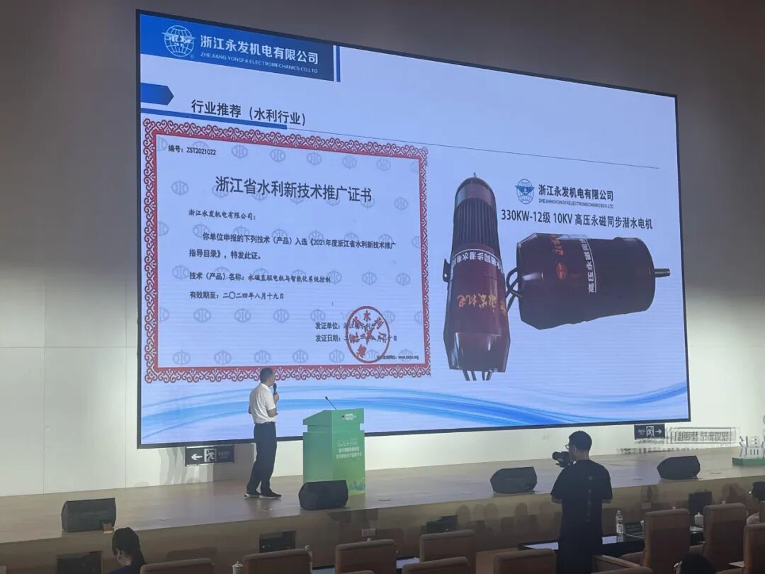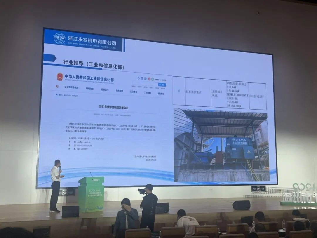 推介会介绍了温州市能源设备更新政策,各县市区认领了节能目标责任书,同时推广了节能电机、节能变压器、新型储能、新型充储一体、节能型天然气锅炉、智慧综合能源服务等绿色低碳技术产品,市发改委、市住建局、市经信局、市能源监测中心、各县(市、区)相关负责人等都参加了推介会,以及参会的还有“十四五”温州市重点用能单位、参加2024年用能预算化管理有关企业分管节能领导或节能管理负责人、有关中介服务机构等。推介会上,多家企业受邀分享了新型绿色低碳技术、产品和应用案例。浙江永发机电有限公司(下称“永发机电”)作为绿色节能电机行业的佼佼者,也受邀进行了主题汇报。